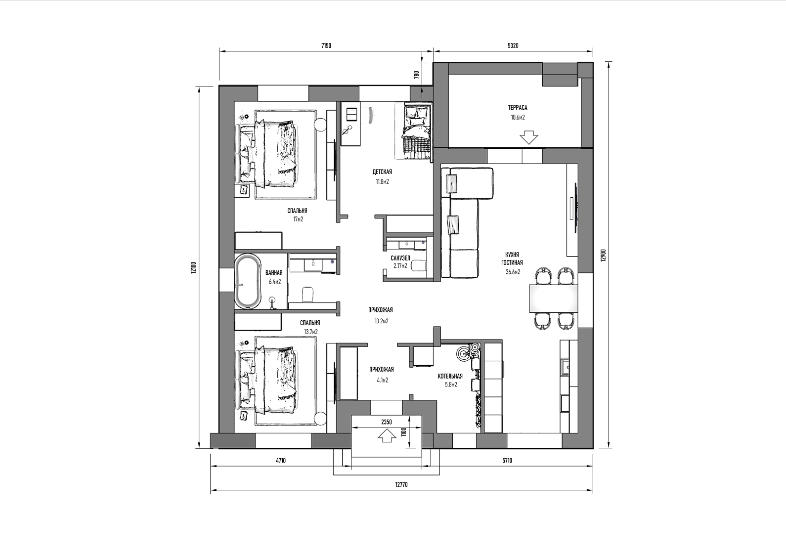 • Крытая терраса: 10,6 м² — зона отдыха с выходом из гостиной.
