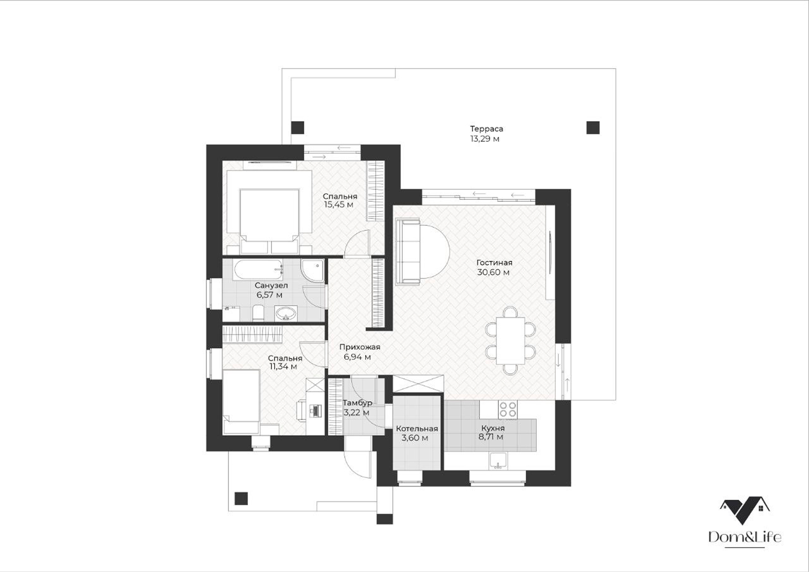 Внешние элементы:- Терраса: 13,29 м² — летняя зона отдыха с перголой и выходом из гостиной.